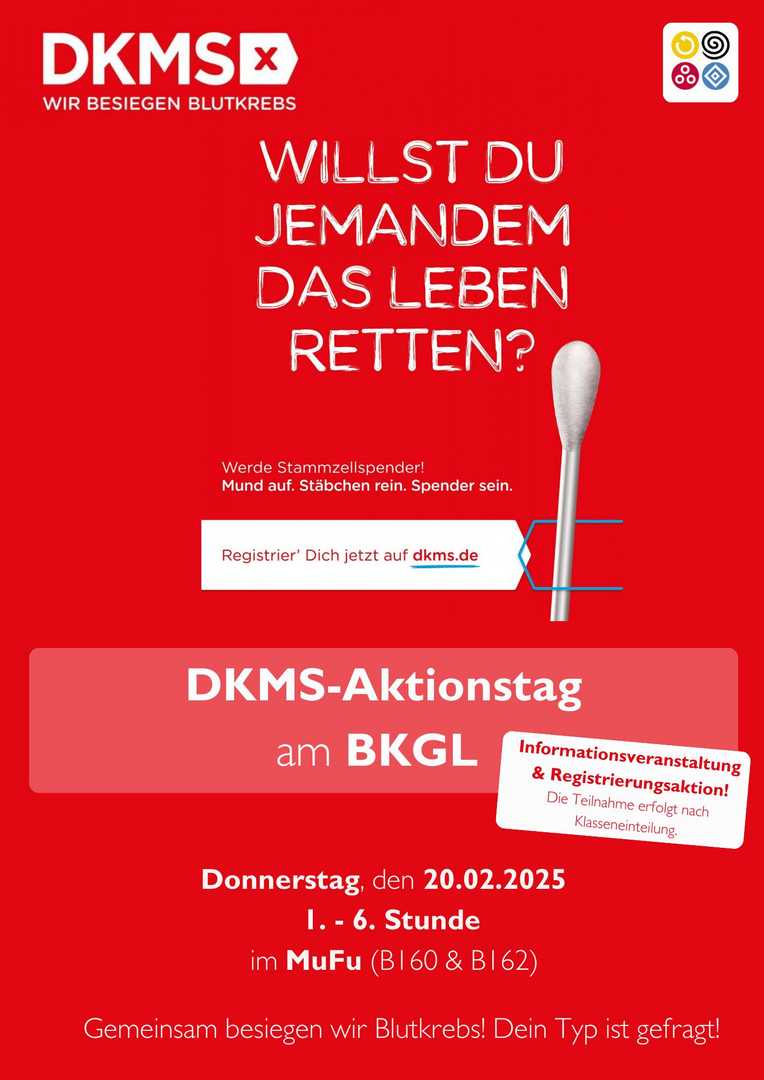 An unserem DKMS-Aktionstag am Donnerstag, den 20.02.25 erhaltet ihr Informationen rund um die Themen Blutkrebs und Stammzellspende. Direkt im Anschluss an die Infoveranstaltung könnt ihr euch als potenzielle Stammzellspenderinnen oder Stammzellspender registrieren lassen und vielleicht bald ein Leben retten.